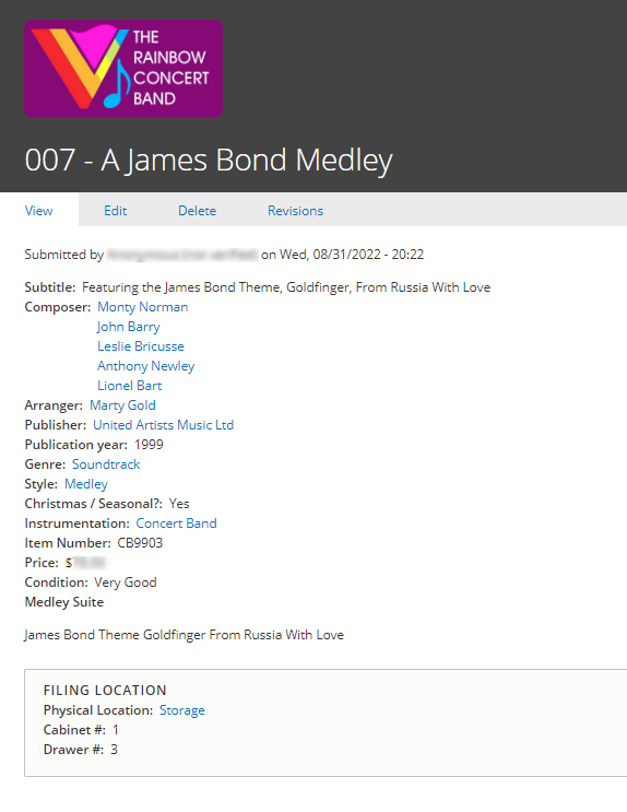 In order to help out someone I know in the Rainbow Concert Band, I volunteered to create an internal-facing administration site which assists the band's director in organizing the compositions the band works with. This site helps coordinate information on a vast amount of sheet music such as title, composer, genre, catalog numbers, as well as contextual information such as where the physical copies are stored and when the music was last performed.