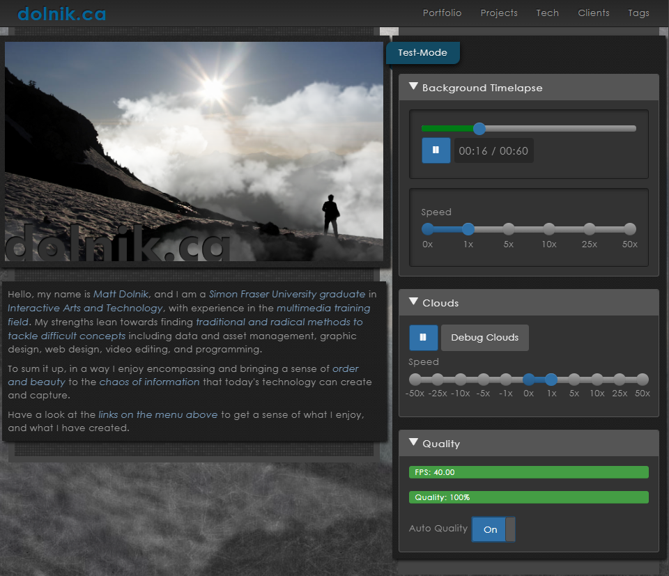 While making tweaks to the home page animation, I needed more control over the animation to ensure there are no performance issues or bugs. I decided to make some simple controls for the various aspects of the animation. I decided to make these controls public as an easter egg when the dolnik.ca logo is clicked within the animation to help show the different aspects of how the animation works.